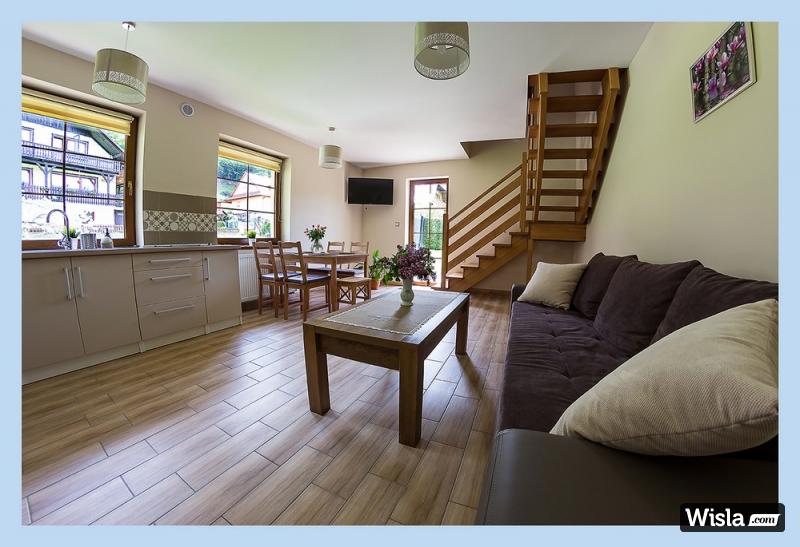 Domek na Leśnej w Wiśle łączy w sobie prostotę i funkcjonalność. W jego skład wchodzą dwa apartamenty, które urządzone są w stylu nowoczesnym i prowansalskim. Oba apartamenty są dwupoziomowe (parter i piętro), posiadają balkony, a wejście do każdego z nich jest odrębne i niezależne. Każdy apartament jest przeznaczony dla 2-5 osób. Dodatkowo istnieje możliwość rozłożenia komfortowej, dwuosobowej kanapy w salonie. W budynku funkcjonuje bezpłatne Wi-Fi.